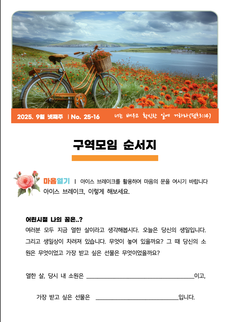 구역나눔지 2025년 9월 28일 구역눔지 페이지 정보 작성자 청소년부 작성일 25-09-27 10:42 조회 46회 본문 9월 28일자 구역나눔지 이전글2025년 10월 12일 구역나눔지 다음글2025년 9월 14일 구역나눔지 목록