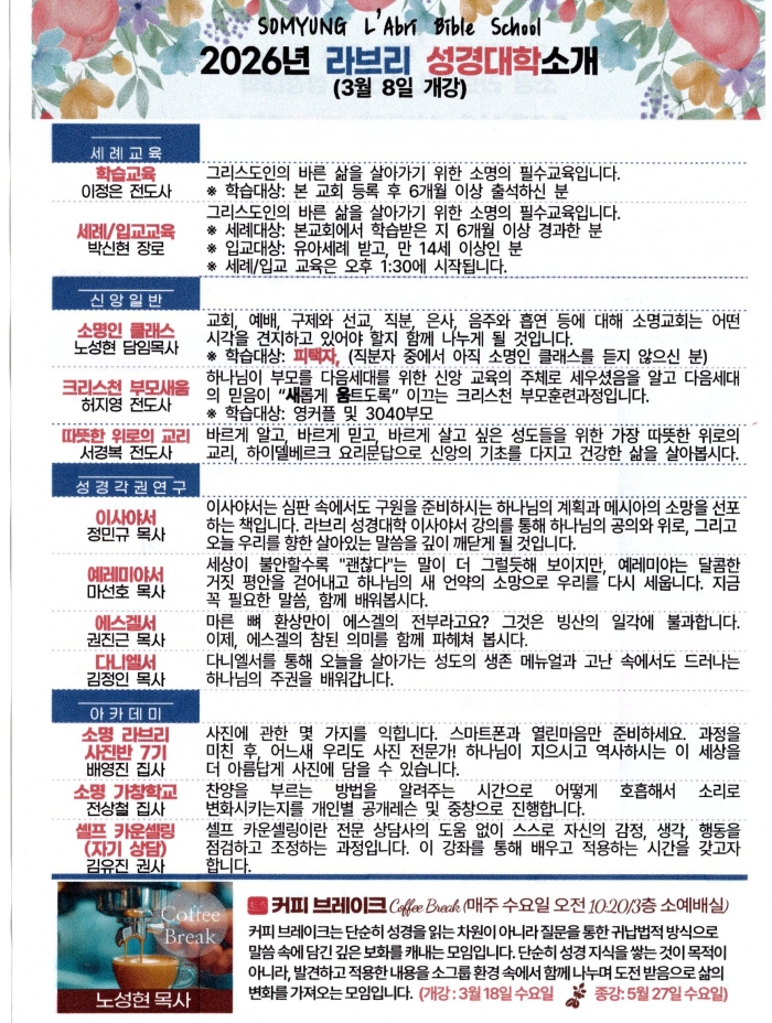 교회소식 2026년 상반기 라브리 성경대학 & 아카데미 개강 페이지 정보 작성자 소명교회 작성일 26-02-25 18:43 조회 7회 본문 다음글은퇴 감사 예배 25.12.7 (주일) 오후 2시 30분 목록