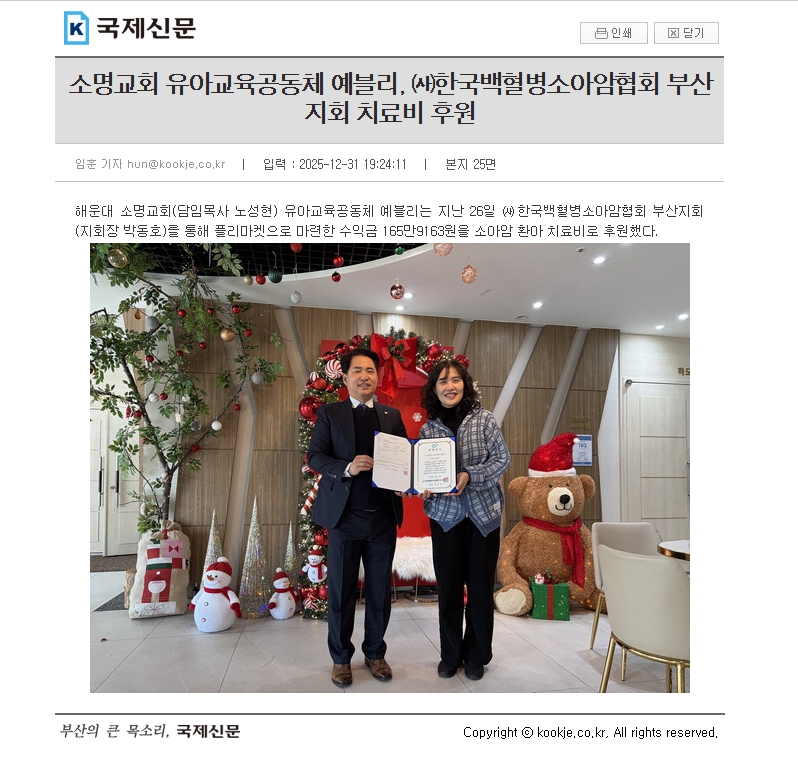 예블리 플리마켓 수익금 소아암 환아 치료비 후원 페이지 정보 작성자 소명교회 댓글 0건 조회 78회 작성일 26-01-07 15:34 목록 본문 기사 바로보기 관련링크 https://www.kookje.co.kr/news2011/asp/newsbody.asp?code=0900&key=20260… 16회 연결 이전글[사진영상사역팀] 2025년 송구영신예배 26.01.09 다음글신년특별기도회첫날2 26.01.05 댓글 0 댓글목록 등록된 댓글이 없습니다.